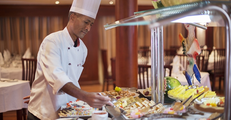 - Main restaurant: Offering a delicious international buffet for Breakfast, Lunch and Dinner, located in lower deck (256 m2 / 136 seat)